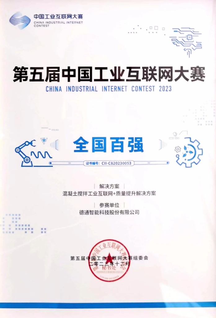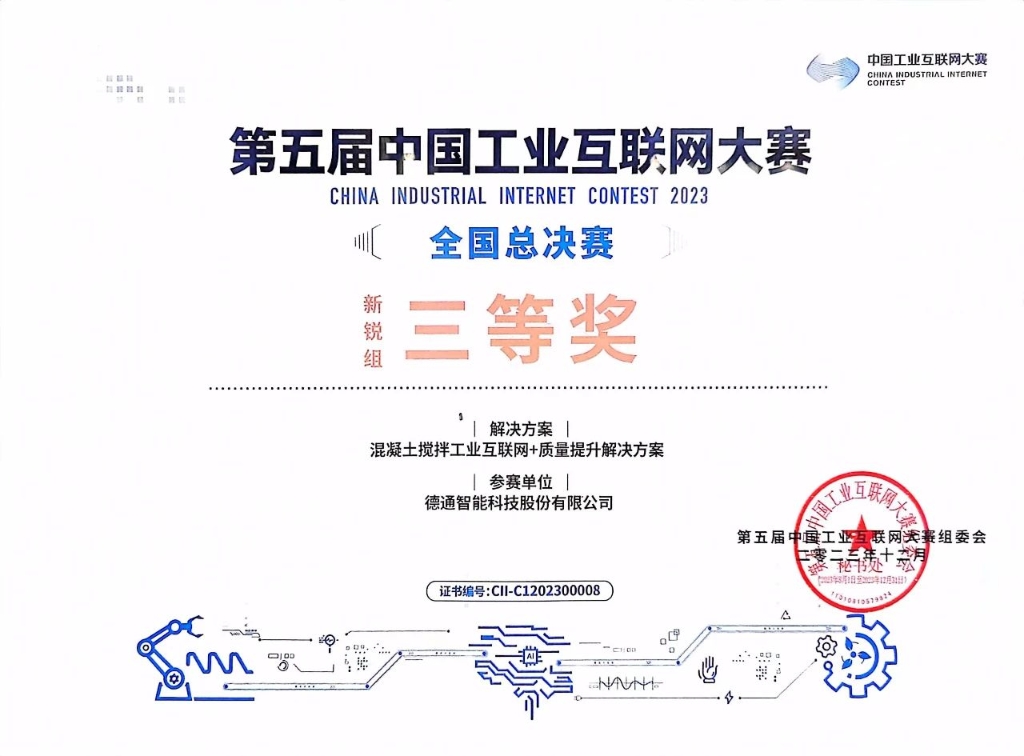 12月22日,由國家工業(yè)和信息化部主辦的第五屆中國工業(yè)互聯(lián)網(wǎng)大賽在浙江寧波圓滿閉幕,德通智能科技股份有限公司的參賽項目《混凝土攪拌工業(yè)互聯(lián)網(wǎng)+質(zhì)量提升解決方案》一路過關斬將闖進總決賽,最終以第8名的成績奪得新銳組三等獎。